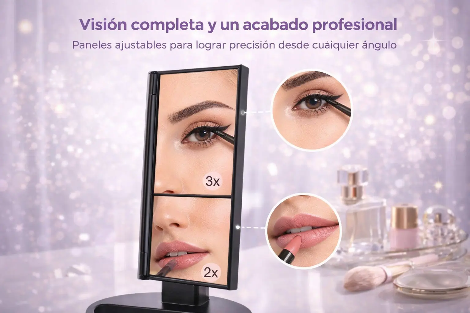 ✔ 3 paneles plegables: visión lateral y frontal para un maquillaje más parejo