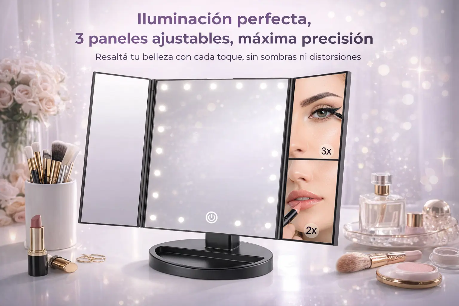 Este espejo con luz LED integrada y diseño de tres paneles está pensado para acompañarte en cada detalle de tu maquillaje y cuidado personal. Su iluminación resalta tu rostro de manera natural, permitiéndote verte con claridad real, sin sombras ni distorsiones.